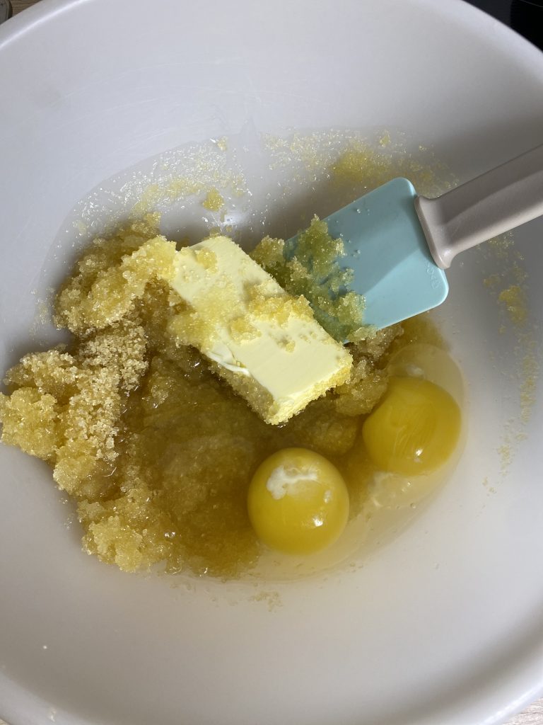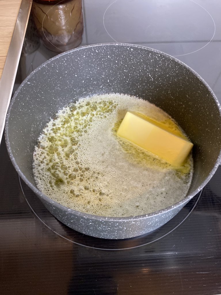 Melt half of the butter (65 g) in a pan over medium heat until golden brown. Let it cool slightly.